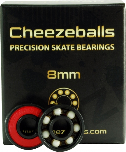 Cheezeball Goudas are an excellent, affordable way to step up into the wonderful world of ceramic bearings. The benefits of ceramic balls are numerous; ceramic balls are made out of some of the hardest materials on earth, which translates into a fast, LONG roll. They require less maintenance as a result and don’t require as much lubrication, which increases bearing response and reduces the amount of contaminants picked up and retained by the bearing. Since ceramic balls are much harder than the steel races they come in contact with they act as dressing stones, effectively self-healing small imperfections on the race surface. Zirconium fiber ceramic is the most shatter-resistant ceramic available in skate bearings so these bearings are designed to handle hard hits and keep rolling. Combine those great qualities with corrosion-proof nylon cages and rust proofed deep groove chrome steel races and you have a great, long lasting ceramic bearing at a price no one else can touch!